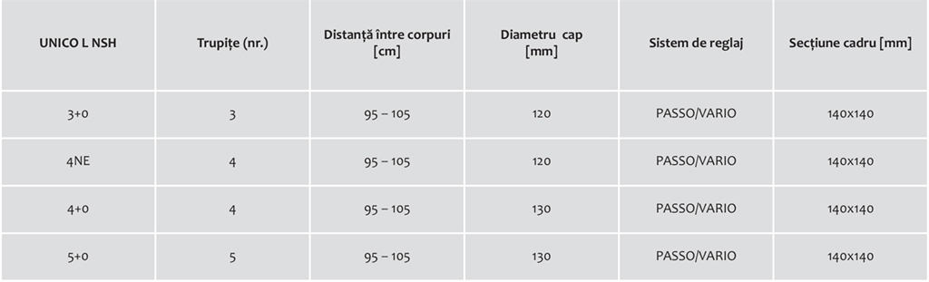 Modelul “UNICO L” este disponibil la ora actuală în configurații de 3 până la 6 trupițe (5+1). Având în vedere greutatea și diferitele configurații disponibile, plugul poate fi combinat cu tractoare de putere medie, de până la 310 [CP].